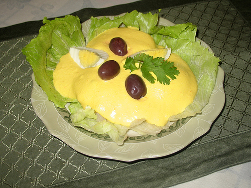 4.-Servir sobre papas cocidas, cortadas en mitades. Decorar con huevos cocidos en rodajas, aceitunas y hojas de lechuga.
